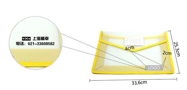 A4 clear document pouch with coloured edge, triangular flap closure with snap fastener.