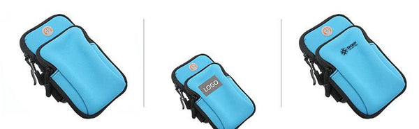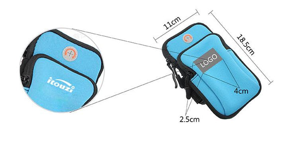 Waterproof armband pouch with zippered compartments and adjustable velcro closure for sports and leisure.
