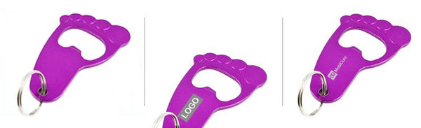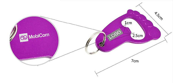 Aluminium keychain and bottle opener in the shape of a footprint.