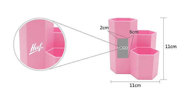 Pen holder in the shape of a honeycomb with 3 compartments.