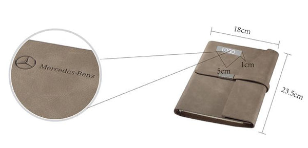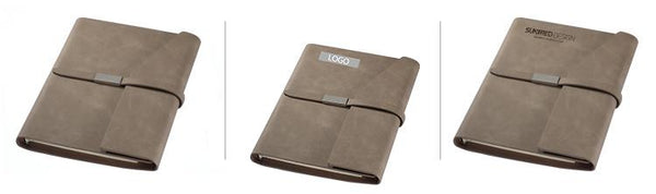 Loose leaf notebook with thin leather strap and flap closure with slanted edge (23.5 x 18cm).