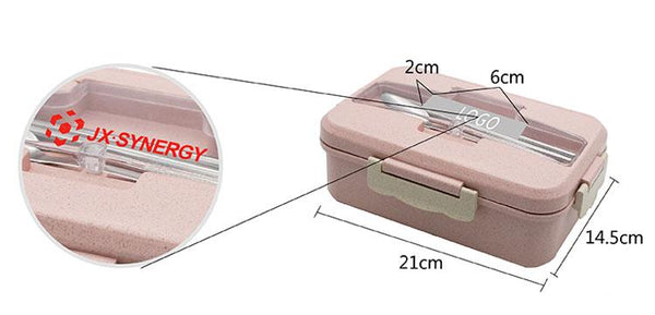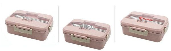 Lunch box with three inner compartments. Snap lock lid includes multifunctional holder with clear cover. Comes with stainless steel chopsticks and spoon.