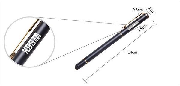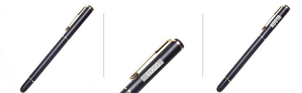 Metal business pen with gold clip and stylus.