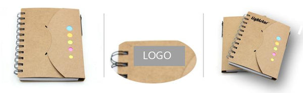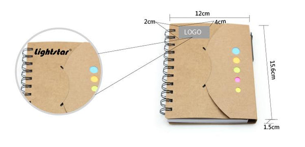 Notebook with kraft paper cover and curved flap closure. includes pen and sticky flag pads in 5 colours.