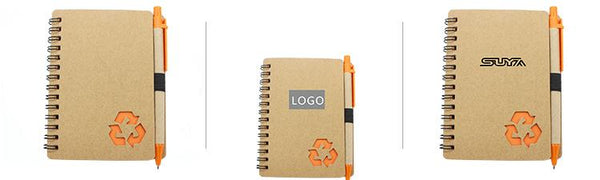 Notebook with recycling symbol on lower right hand of cover and eco-friendly pen.