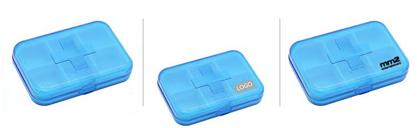 Pill box with first aid logo on cover and 6 compartments.