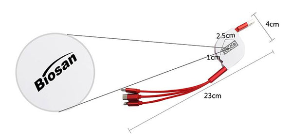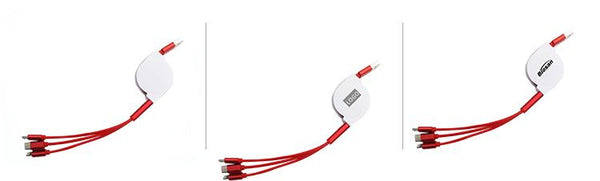 Retractable 3-in-1 charging cable set. Includes USB connector and 3 cable types.