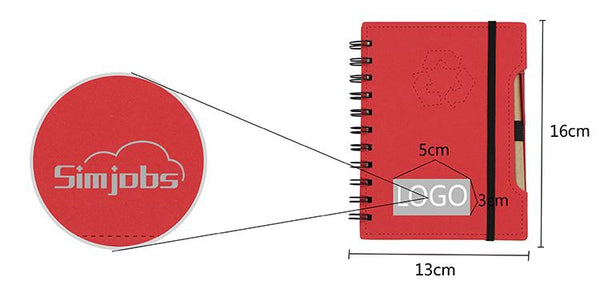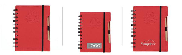Spiral-bound notebook with recycle symbol embossed on cover. Includes vertical elastic band closure and pen.