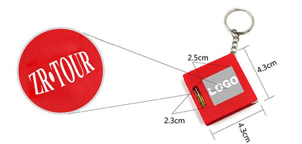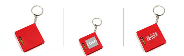 Square keychain with spirit level and retractable tape measure (length 1m).
