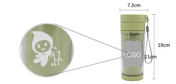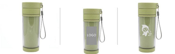 Portable clear insulated tea cup with screw cap, strainer and strap.