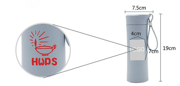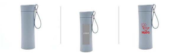 Wheat fibre drinking bottle with thick rubber strap (350ml capacity).