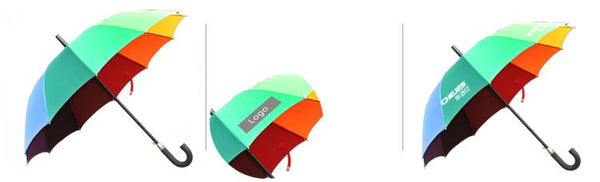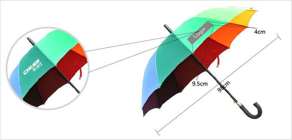 Non-collapsible rainbow coloured umbrella with curved foam rubber handle.