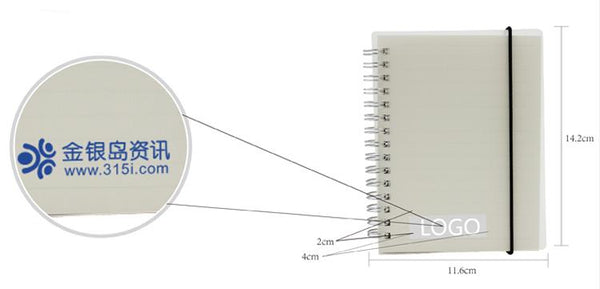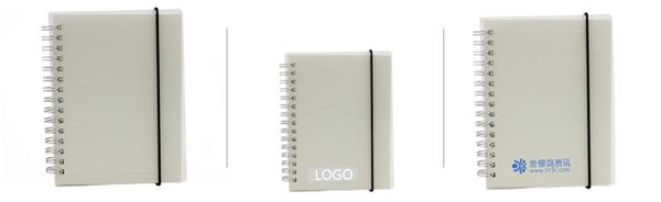 A6 spiral-bound notebook with clear cover, lined pages and elastic band closure.