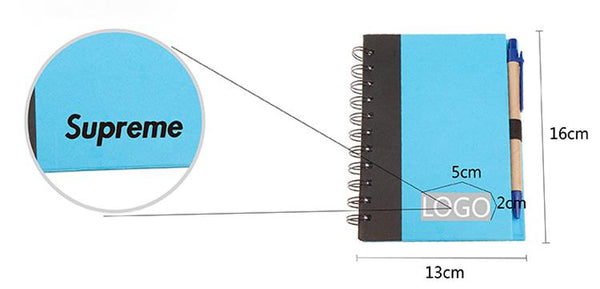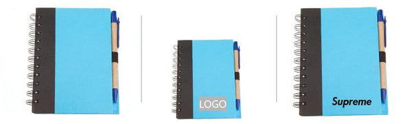 Eco-friendly notebook with coloured cover and eco-friendly pen.