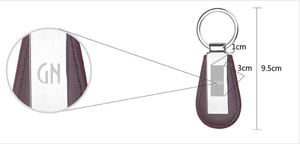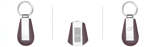 Teardrop-shaped stitched leather keychain with metal overlay.
