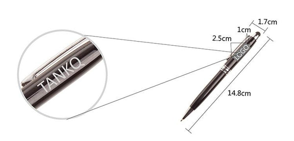 Metal twist-type ballpoint pen with stylus and thick silver strip on body.