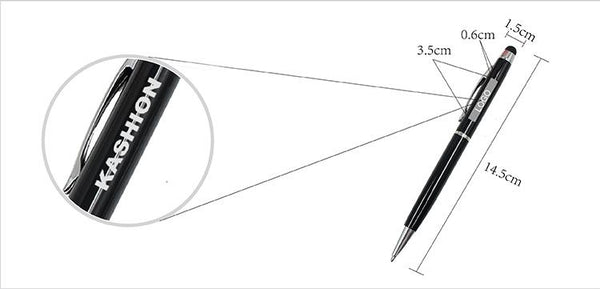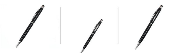 Metal twist-type business pen with stylus, silver tip and silver clip.