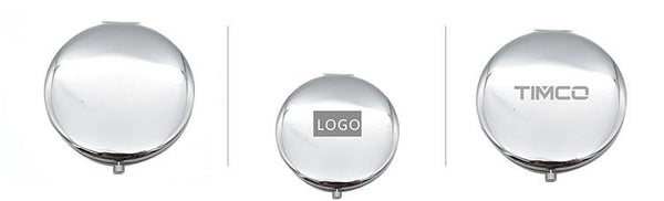 Compact round flipcase folding mirror with flamingo designs on cover.