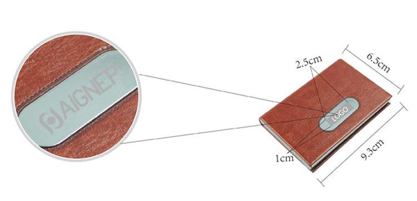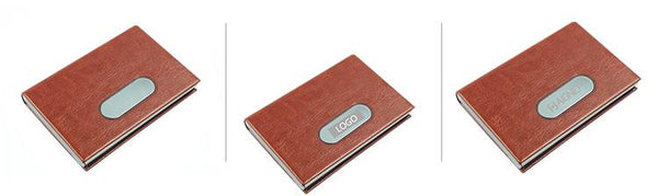 Stainless steel business name card holder with flip-open case and rounded metal plate on PU leather cover.