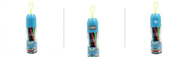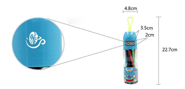 Set of 12 washable watercolour markers in coloured bottle with cartoon character design and strap.